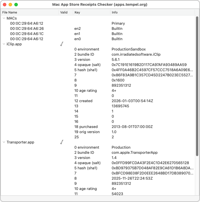Here's a sample output showing first the MACs of the Mac, then two checked apps and their receipt properties.